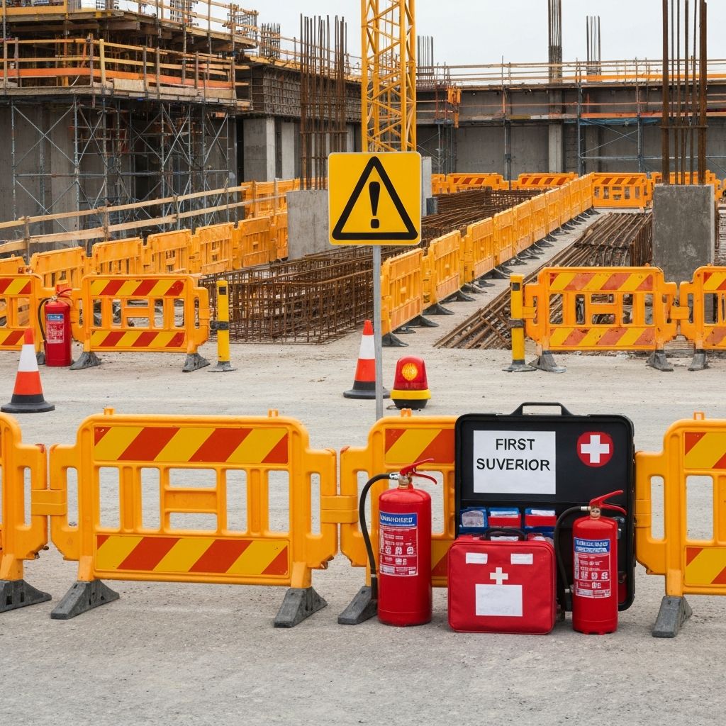 Barriers, warning systems, fire extinguishers, fall protection, and first aid systems.